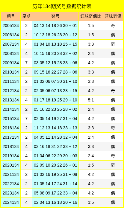蓝球:在历史第134期同期开奖中,号码奇偶比为6:14,最近5年蓝球奇偶走势为:奇数、偶数、偶数、偶数、偶数,今年预计蓝球开出奇数号码,参考蓝球号码15。