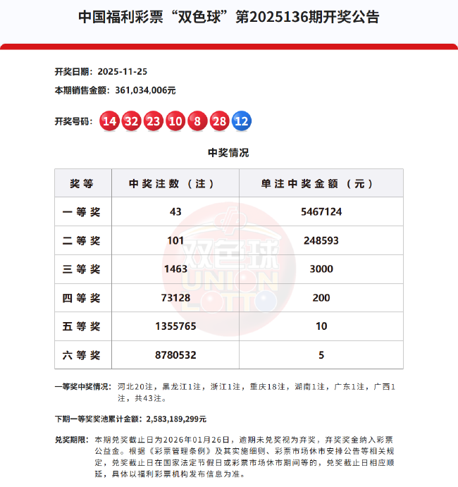 北京时间2025年11月25日,福彩双色球第25136期开奖,当期开奖号码为红球08 10 14 23 28 32,蓝球12。本期双色球井喷43注一等奖,单注奖金546万余元,其中20注落于河北、还有18注出自重庆。经检索,河北20注头奖均出自唐山市路北区大庆10号华宇超市,第13150086号销售网点,单票擒奖1.09亿元;重庆中出的18注头奖均出自北碚区(现两江新区)水土高新园兴凯路198号,第40100169号销售网点,单票中奖9840万,险些同期爆出两个亿元巨奖!