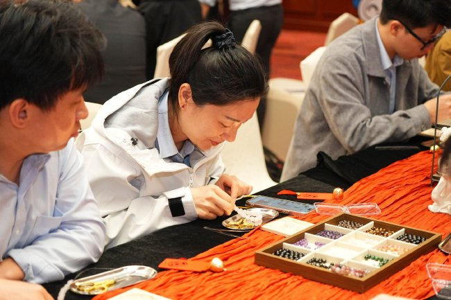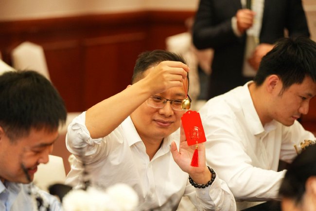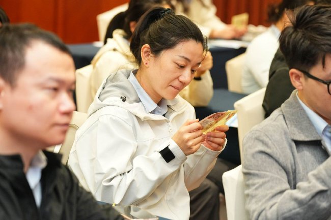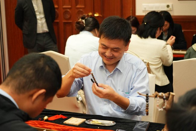 非遗国潮手作环节的现场布置尤为精心,处处彰显巧思:桌面以沉稳的深色桌布为底,上方覆盖着温润典雅的橙色桌旗,色彩对比间尽显格调,桌上错落摆放着多款水晶项链装饰摆件与质感细腻的雕纹盒,为现场增添了几分雅致韵味,让金融白领们在忙碌之余快速卸下疲惫。主讲老师寥寥数语诠释水晶寓意:蓝水晶映照“清醒判断”,黄水晶代表“价值认知”,紫水晶寓意“自我约束”。在专业老师指导下,参会者亲手挑选水晶、串联成型,把理性与责任“戴”在手上。“这串手串既是活动的纪念,更是日常的提醒,往后不管是自己购彩还是与他人分享,都会记得这份清醒与克制。”一位参会者手持成品感慨道。