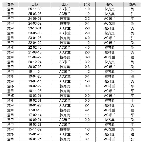拉齐奥 VS AC米兰两队近10年的交战次数为28场,拉齐奥8胜7平13负,赢球概率为28.6%,平局概率为25.0%,输球概率为46.4%。