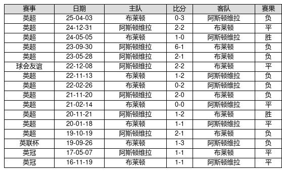 布莱顿 VS 阿斯顿维拉两队近10年的交战次数为16场,布莱顿2胜6平8负,赢球概率为12.5%,平局概率为37.5%,输球概率为50.0%。