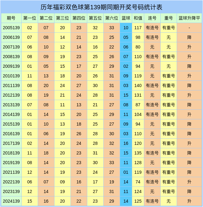 和值分析:在历史同期开奖中,红球和值出现范围在74-140之间,区间内的最大波动差值为66,其中['大']数和值开出频次较高,共出现了13次,当前大数和值开出了13年,今年同期预计和值继续走小。