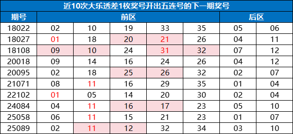 小编回查了近10次大乐透差1枚奖号开出五连号的下一期奖号,总结出以下几个特点可供选号时参考。首先,这10期开奖有5次开出了连号形态占比达到一半,考虑到近期大乐透开奖连号形态回暖,彩民可适当留意。其次,前区1尾共有7次开出占比高达70%,且号码11近5次开4次,或许应在下期选号时多加参考。此外这10期开奖中近3次均出现了号码断区现象,同时目前前区三区连续2期空开,这是否意味着下期开奖还会有断区现象出现,让我们拭目以待!