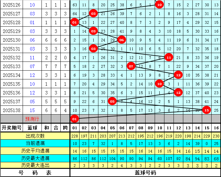 遗漏分析:最近7期红球遗漏总值分别为:20、21、30、20、19、29、11,开出2个遗漏值9以上的冷码红球,目前红球遗漏值9以上的冷码红球有5个:06、12、15、16、22,本期注意冷码解冻,参考红球号码15。