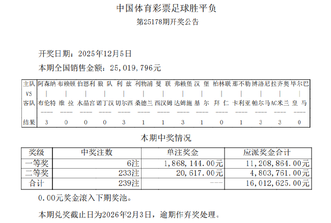北京时间12月5日,胜负彩第25178期开奖结果揭晓。本期14场头奖开出6注,单注奖金1,868,144元;二等奖开出233注,单注奖金20,617元。任九开出2505注,单注奖金5400元。本期胜负彩销量为25,019,796元,任九投注总额为21,136,706元