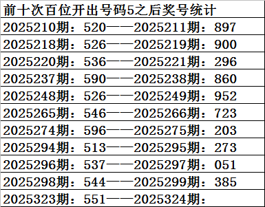 二、百位分析:上期开出号码5,前10次号码5出现之后下期分别开出号码:8928972203,其中号码大小比为5:5,相等;奇偶比为4:6,基本相等;012路比为4:1:5,2路号码表现非常热。本期参考号码:5。
