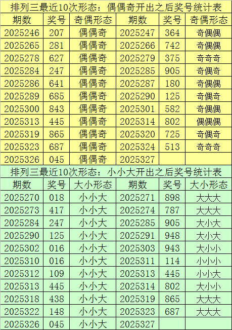 排列三最近10次同时开出奇偶形态:偶偶奇和大小形态:小小大时其奖号分别为:425-249-027-407-425-029-009-207-247-445-045,下期分别开出号码为:841-172-471-425-113-192-373-364-905-802,详细统计见下表: