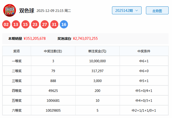 双色球第2025142期开奖号码为:02、13、15、23、27、31+16。其中红球三区比为1:2:3,奇偶比为5:1,包含2个重号:02、13,蓝球出现在第四区。