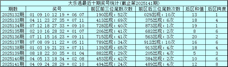 体彩大乐透第25141期奖号开出:04 09 24 28 29+02 10,前区奖号大小比为3:2,012路比为2:2:1,奇偶比为2:3,后区号码和值为12,跨度为8。