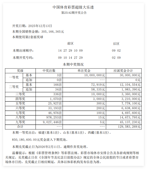 本期全国销量为3.05亿元,奖池方面,8.50亿余元滚存至12月15日(周一)开奖的第25143期。