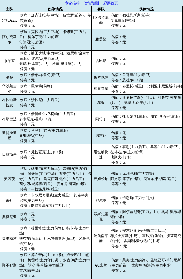 伤停点评:胜负彩第25189期由欧协联和意超杯赛事组成。欧协联赛场,阿尔克马尔队长克拉西伤缺,水晶宫中后场伤病较多,美因茨6大主力伤缺。采列队长主力后卫卡尔尼奇尼克停赛,主力后卫图纳斯基纳斯因红牌停赛。意超杯赛场,那不勒斯5大主力伤缺,AC米兰3大主力伤缺。