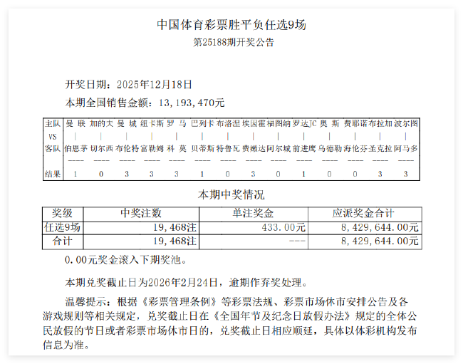 北京时间12月18日,足彩第25188期任九开奖结果揭晓。本期任九开出19468注433元,本期任九投注总额为13,193,470元。