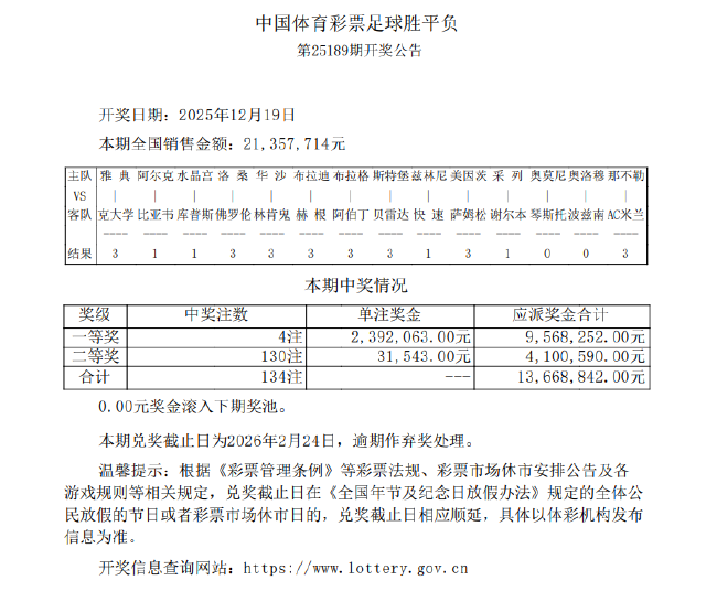 北京时间12月19日,胜负彩第25189期开奖结果揭晓。本期一等奖开出4注,单注奖金2,392,063元;二等奖开出130注,单注奖金31,543元;任九开857注11,210元。本期胜负彩销量为21,357,714元,任九总投注额为15,010,990元。