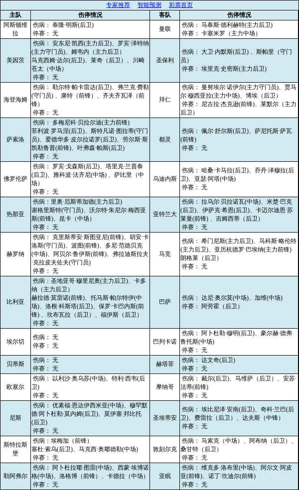 伤病点评:胜负彩第25191期由英超、德甲、意甲、西甲、法国杯组成。英超赛场,曼联主力后卫德利赫特伤缺,主力中场卡塞米罗累计黄牌停赛。德甲赛场,拜仁主力门将诺伊尔受伤、圣保利主力后卫停赛。意甲赛场,萨索洛多人伤缺。西甲赛场,马竞多名主力缺战,比利亚多人受伤,巴萨后卫阿劳霍请假。