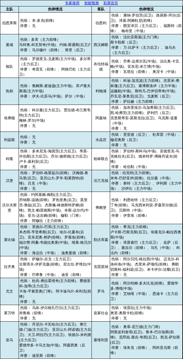 伤病点评:胜负彩第25190期由英超、德甲、意甲、西甲组成。非洲杯即将开战,多支球队均有球员被国家队抽调,包括利物浦前锋萨拉赫,曼城的马尔穆什、努里,西汉姆联后卫万比萨卡等。西甲赛程,皇马多名主力伤缺,包括卡瓦哈尔、门迪、米利唐等均无法出战。