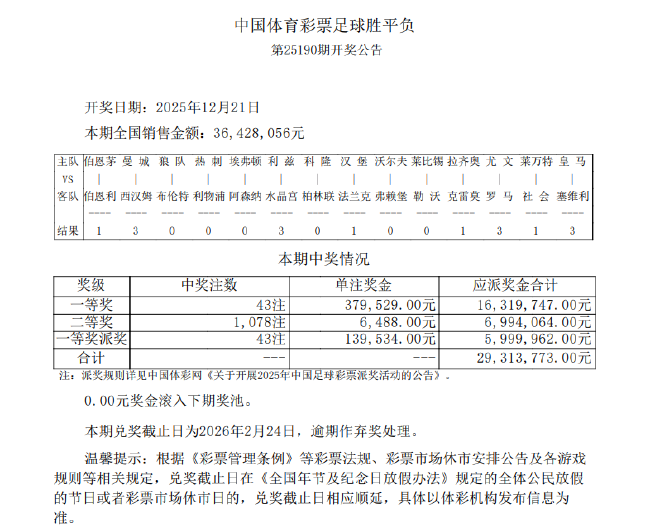 北京时间12月21日,足彩第25190期开奖结果揭晓。足彩派奖头奖开出43注,单注奖金379,529元,本期600万派奖奖金全部派完,每注多得139,534元,单注共计519,063元。二等奖开出1,078注6,488元。任九开出9,693注1,906元,因派奖每注可多得619元,单注共计2,525元。本期14场销量为36,428,056元,任九投注总额为28,872,256元。