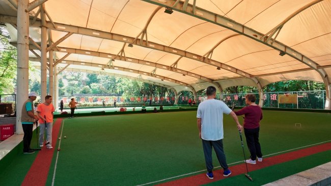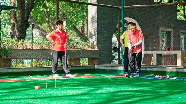 门球是一项历史悠久且特色鲜明的运动,起源于法国,13世纪传入英国,17世纪传入意大利,此后传到美国。20世纪30年代传入中国,当时只在燕京大学作为游戏课内容,后来逐渐在国内普及。在不少人的固有印象里,门球是公园角落里的“银发运动”,节奏舒缓、波澜不惊。但事实上,它像高尔夫一样需要精准击球,像台球一样讲究角度与碰撞,更像围棋一般注重全局谋划。比赛中,两队各5名队员,每人一球,在20米×15米的场地上,依次让球穿过三道球门,最终撞柱得分。一杆一击之间,既有个人技术的展现,更考验团队间的战术配合与临场应变。
