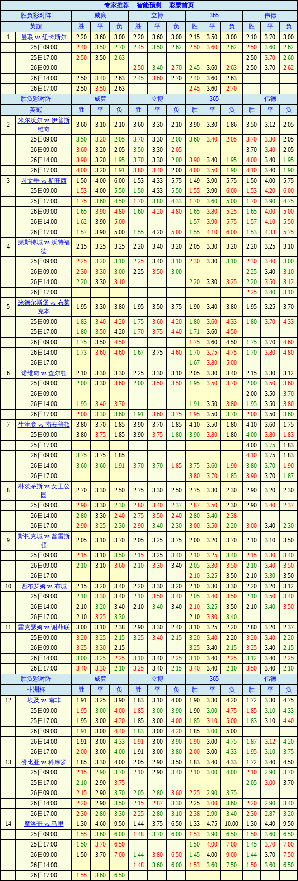 胜负彩25193期欧洲四大机构最新数据(17:00)