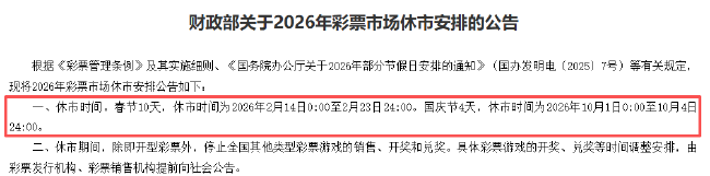 编者按:北京时间2025年12月20日,财政部发布2026年彩票休市公告。2026年彩市休市时间与2025年保持一致,春节休市10天,休市时间为2026年2月14日0:00至2月23日24:00;国庆节休市4天,休市时间为2026年10月1日0:00至10月4日24:00。