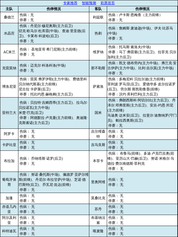 伤病点评:胜负彩第25195期由英超、意甲、葡超、非洲杯组成。英超赛场,利兹联主力前锋伤缺,水晶宫主力后卫无法上场;意甲赛场,AC米兰主力前锋伤缺,萨索洛、亚特兰大等队均有主力球员收到国家队征召,博洛尼亚进攻端两大主力受伤,国米后防线受损。