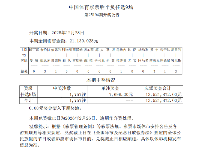 北京时间12月28日,足彩第25194期开奖结果揭晓。本期任选九场开出1,757注,单注奖金7,696元。本期任九投注总额为21,130,028元。