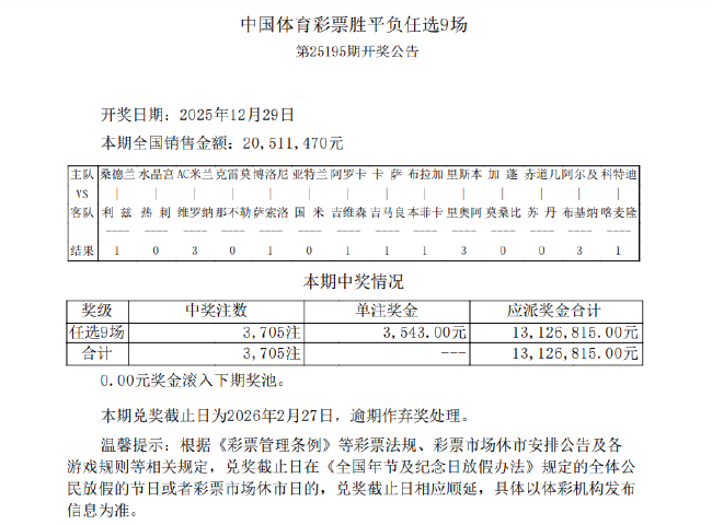 北京时间12月29日,胜负彩第25195期任九开奖结果揭晓。本期任九开出3,705注,单注奖金3,543元,本期任九的投注总额为20,511,470元。