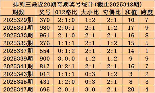 上期回顾:排列三2025348期奖号为373,奇偶比为3:0,大小比为1:2,跨度为13。