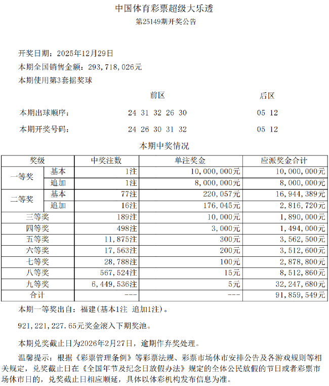 本期全国仅开出1注一等奖,单注奖金1800万元(含800万元追加奖金),花落福建。二等奖开出77注,单注奖金22万余元,其中16注采用追加投注,每注多得奖金17.6万余元。本期全国销量为2.93亿元,奖池方面,9.21亿余元滚存至12月31日(周三)开奖的第25150期。