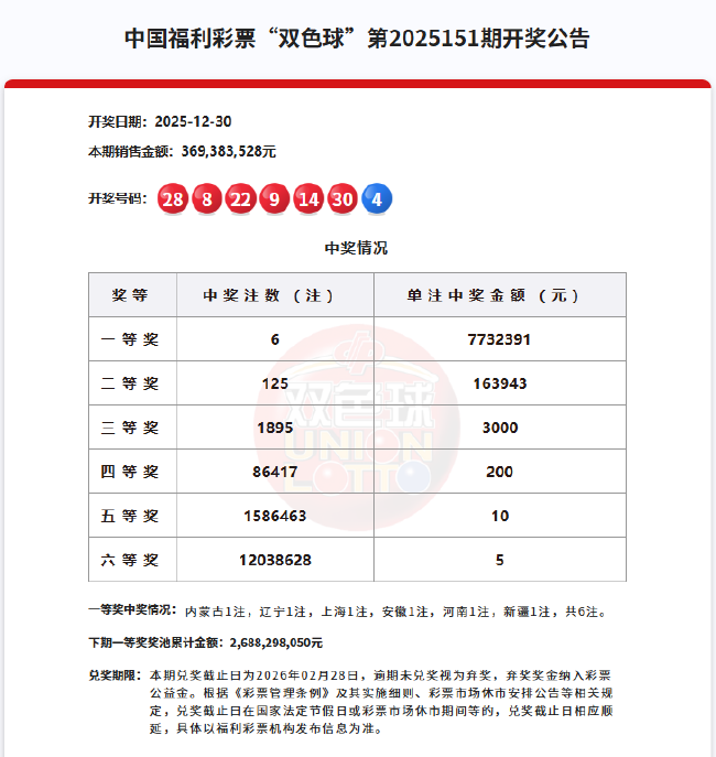 北京时间2025年12月30日,福彩双色球第25151期开奖,以下是详细开奖流程: