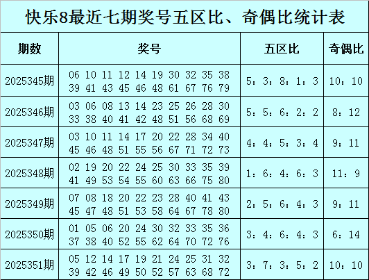 福彩快乐8第2025351期开奖回顾:05 12 14 17 19 21 24 25 31 32 39 42 46 49 50 52 57 63 68 72,其中奖号五区比为3:7:3:5:2,奇偶比为10:10,012路比为8:6:6。