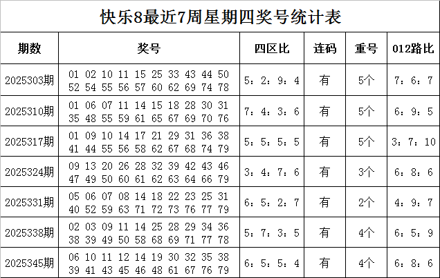 福彩快乐8第2025345期(上周四)奖号回顾:06 10 11 12 14 19 30 32 35 38 39 41 43 45 46 48 61 67 76 79,其中奖号四区比为6:5:5:4,012路比为6:8:6,包含4个重号11、14、38、39,包含连码10 11 12、38 39、45 46。