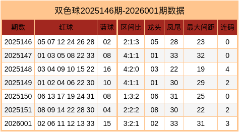 开奖回顾:双色球第2026001期奖号为:02、06、11、12、13、33 + 15。
