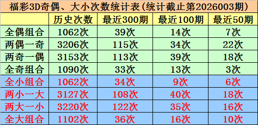 奇偶、大小分析:在最近50期开奖中,全偶组合开出7次,当前遗漏10期、两偶一奇组合开出22次,当前遗漏0期、两奇一偶组合开出18次,当前遗漏5期、全奇组合开出3次,当前遗漏31期,本期注意两奇一偶组合;两小一大组合出现18期,当前轮空0期、两大一小组合出现16期,当前轮空2期、全大组合出现10期,当前轮空8期、全小组合出现6期,当前轮空14期,本期看好开出两大一小组合。