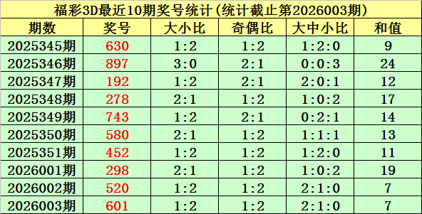 开奖回顾:福彩3D第2026003期奖号为:601。奖号类型为组六,和值为7,奇偶比为1:2,跨度为6,012路比为2:1:0,大小比为1:2。
