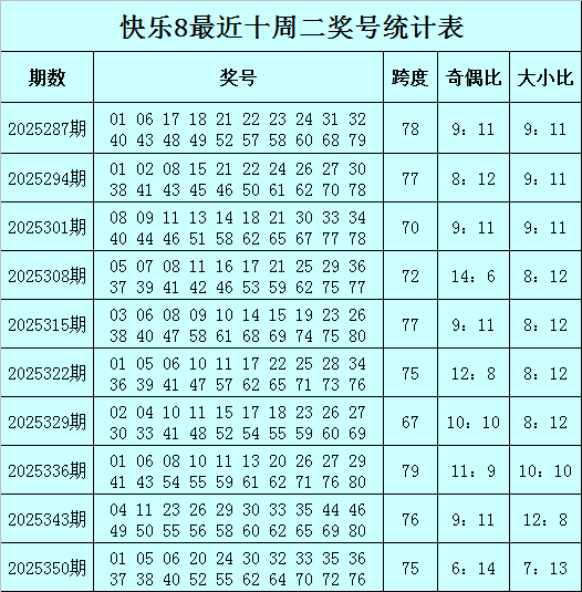 福彩快乐8第2025350期(上周二)开奖回顾:01 05 06 20 24 30 32 33 35 36 37 38 40 52 55 62 64 70 72 76,其中奖号奇偶比为6:14,大小比为7:13,012路比为6:8:6,首尾间距为75。