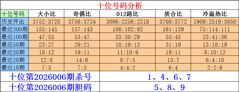 近期十位奇数表现活跃,目前遗漏1期,本期看好再出;该位温冷号码近期出现较少,上期开出温冷号码之后,本期预计温冷号码再出。十位杀号:1467,胆码关注:589。