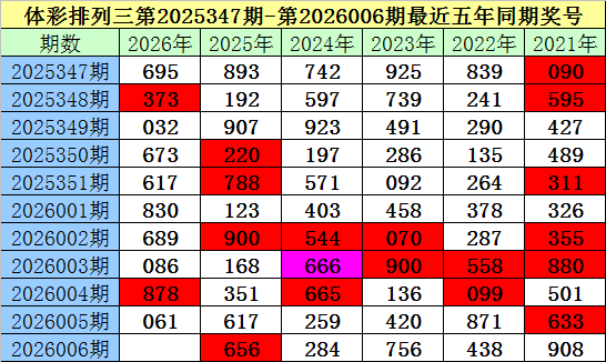 夏姐体彩排列三第2026006期奖号推荐: