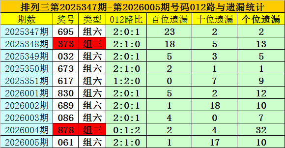 开奖回顾:排列三第2026005期奖号为:061,类型为组六,号码012路比为2:1:0,百十个位号码直选分别遗漏1期、17期和10期。
