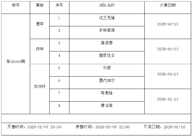 北京时间2026年1月6日,国家体彩中心公布了2026年1月9日-1月15日的足彩赛程,1月9日(周五)、1月10日(周六)、1月11日(周日)、1月12日(周一)、1月14日(周三)共5期。其中26005期竞猜足总杯德甲西甲荷甲荷乙非洲杯等赛事、第26006期由足总杯德甲意甲和西甲赛事组成、26007期由足总杯德甲意甲西甲法国杯荷甲组成、26008期由竞猜足总杯联赛杯德甲意甲意大利杯西甲法国杯荷乙荷兰杯共9大赛事、26009期为联赛杯德甲意甲和荷兰杯。