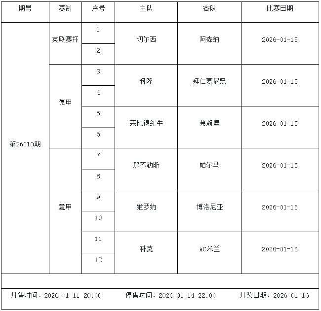 我中心制定了2026年中国足球彩票胜负游戏(14场、任选9场)、6场半全场胜负游戏和4场进球游戏1月9日-1月15日的竞猜场次安排(具体附后),其竞猜对象、开售时间、停售时间和计奖时间均以本文为准。