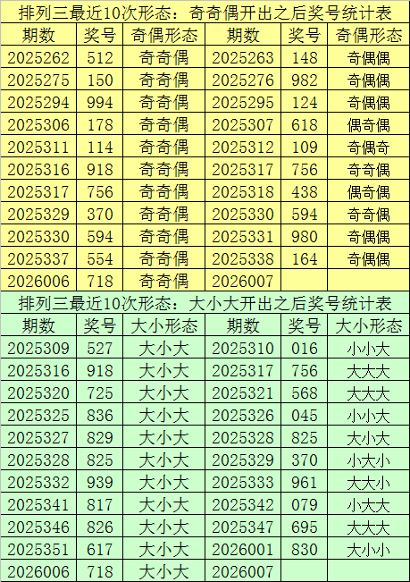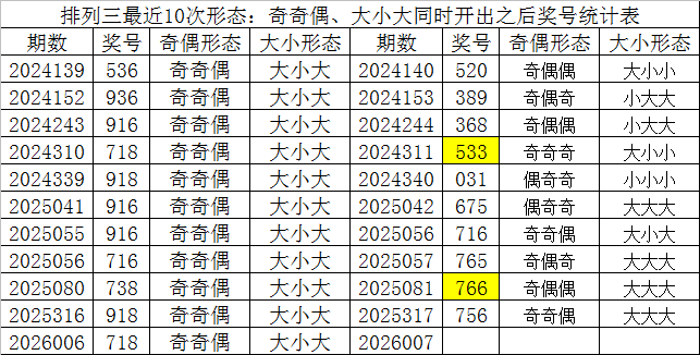 排列三最近10次同时开出奇偶形态:奇奇偶和大小形态:大小大时其奖号分别为:536-936-916-718-918-916-916-716-738-918-718,下期分别开出号码为:520-389-368-533-031-675-716-765-766-756,详细统计见下表: