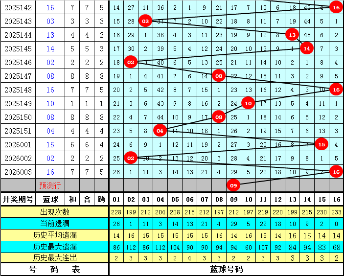 上期开出蓝球号码16,该号码在最近300期中出现了24次,其下期分别开出:蓝球05出现3次,蓝球01、03、04、08、10、11、13出现2次,蓝球02、06、12、14、15、16出现1次,蓝球07、09出现0次。本期五码蓝球参考04、09、12、14、15,独蓝关注09。