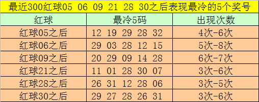 红球冷码统计:双色球第2026003期开出红球奖号分别为:05、06、09、21、28、30,在最近300期开奖中,各号码出现之后其下期出现最少的5个红球分别为: