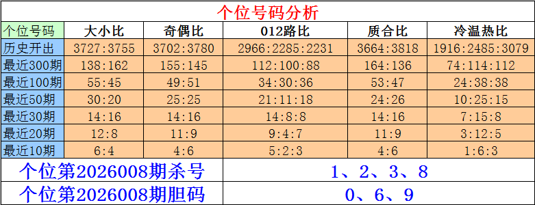近期个位合数号码出现频率较低,最近2期连出,明显转热,本期预计奖号再为合数;近期该位大号热出,大号连出2期,本期继续关注大号。个位杀号:1238,胆码关注:069。