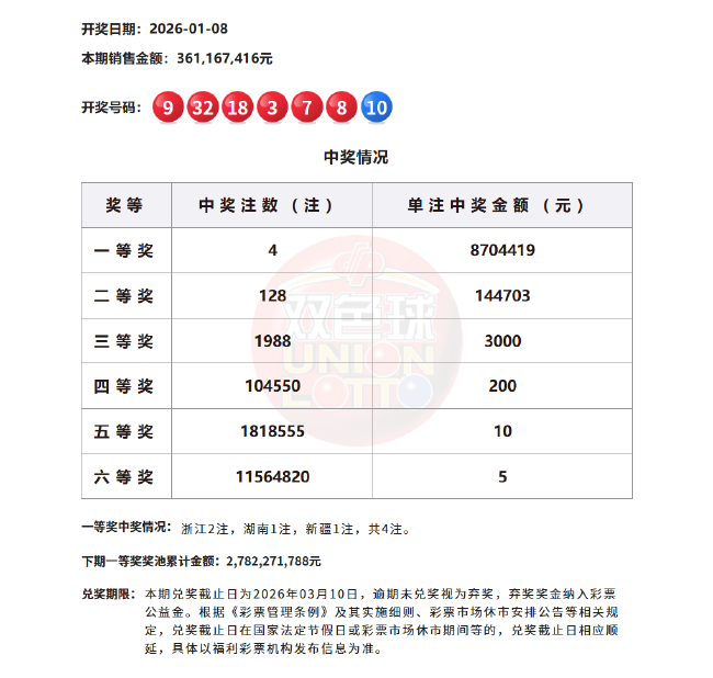 22:10 本期一等奖开出4注,单注奖金870万余元,4注头奖分落3地,其中浙江中出2注,湖南、新疆各1注。二等奖开出128注,单注奖金14.4万余元。本期双色球全国销量为3.61亿余元,计奖结束后奖池余额为27.82亿余元。