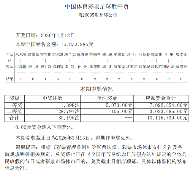 北京时间1月12日,胜负彩第26005期开奖结果揭晓。本期足彩头奖共开出1398注,单注奖金5073元;二等奖开出28,797注105元;任九开168,167注29元。本期胜负彩销量为15,833,286元,任九投注总额为7,852,816元。