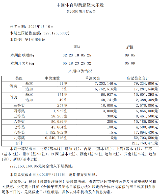 本期全国开出11注一等奖,单注奖金720万余元;其中3注选择追加,多得奖金576万余元,追加头奖1296万。本期3注追加头奖中北京、湖南、云南各中出1注。8注基本头奖出自云南(2注)、内蒙古、上海、江苏、浙江、江西和新疆。二等奖开出174注,单注奖金6万余元,其中49注采用追加投注,每注多得奖金4.8万余元。本期全国销量为3.29亿元,奖池方面,7.79亿余元滚存至1月12日(周一)开奖的第26005期。