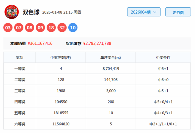 开奖回顾:双色球第2026004期奖号为:03 07 08 09 18 32 + 10,其中红球号码奇偶比为3:3,大小比为2:4,012路比为3:1:2,三区比为4:1:1。