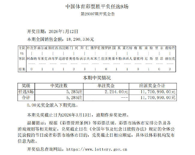 北京时间1月12日,胜负彩第26007期任九开奖结果揭晓。本期任九开出5,285注,单注奖金2,214元,本期任九的投注总额为18,290,336元。