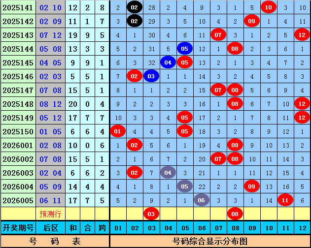后区奖号分析:上期后区开出奖号06+11,奖号和值为17,跨度为5,本期预计后区和值转小,关注两码03 08。